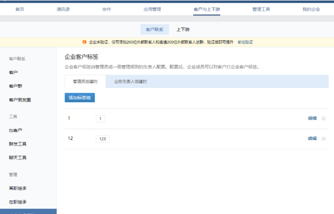 企業微信能給客戶添加企業標簽和個人標簽,首先說說企業標簽是怎樣操作的?管理員登錄企業微信后臺,通過路徑【客戶與上下游】—【客戶聯系】—【企業客戶標簽】,就可以對標簽組進行創建與管理。