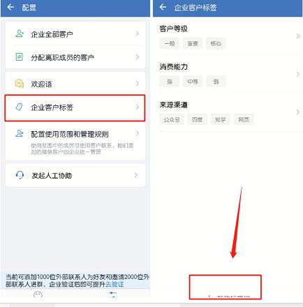 首先,企業微信標簽分為企業標簽和個人標簽,企業標簽只可以由管理員設置添加,通過手機企業微信,管理員按照路徑【工作臺】—【客戶聯系】—【配置】—【企業微信標簽】進入企業客戶標簽頁面,就能在下方新建標簽組,完成企業標簽添加。