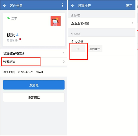 個人標簽是由員工設置添加,只需企業員工點擊客戶頭像,并進入客戶信息頁面,再在“客戶信息”頁面中選擇“設置標簽”,即可在個人標簽中添加個性化的標簽。