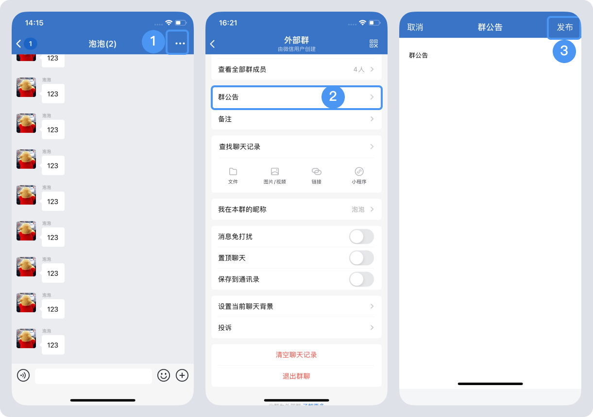 登錄手機端企業微信,進入群聊聊天頁面,點擊右上角的三個點“...”——“群公告”——設置好群公告相關內容——“發布”即可。